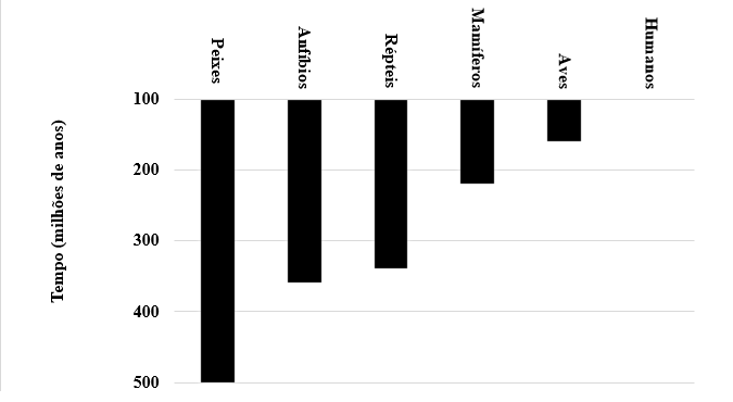 Fig. 1 - Registros fosseis de diferentes classes de animais e de humanos ao longo de milhões de anos. Os registros de fosseis humanos seriam há 0,05 milhões de anos, muito abaixo da escala. (LAMOUREUX, 2008, p. 26).