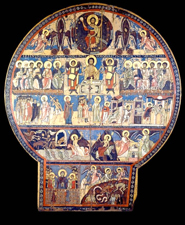 O círculo utilizado é símbolo de perfeição, porque não possui início nem fim, e representa o universo inteiro, infinito, sem tempo e perfeito, enquanto criação divina. A forma em círculo, ainda que incompleto, indica a ideia principal da obra, ilustrada em seu interior. De cima para baixo, o primeiro registro traz, ao centro, o Cristo Pantocrátor, o Senhor da Criação, majestoso sentado sobre o arco íris, símbolo do cosmo. Ele segura a cruz gloriosa, caracterizada pelas pedras preciosas, e um globo, símbolo do universo com uma inscrição no seu interior: “Eu venci o mundo” (Jo 16, 33). O Cristo está entre dois anjos e dois serafins com seis asas, como descreve o Livro do Profeta Ezequiel (Ez 10, 12) e sobre rodas de fogo (cf. Ez 1, 15-20; 10, 9-12). No segundo registro, vê-se o Cristo orante, atrás de um altar, com os símbolos da Paixão, um livro (Cf. Ap 20,12-15) e um cálice. Dois anjos, com vestes de cor vermelha e dourada, o ladeiam e mostram dois pergaminhos: um, com a sentença prêmio: “Vinde, benditos de meu pai, tomai posse do Reino”, e outro, com a sentença de condenação: “afastai-vos de mim, malditos para o castigo eterno”, de acordo com o texto de Mt 25, 31-46. Cada anjo, com a outra mão, segura um globo, sendo um claro e outro escuro, provavelmente simbolizando o sol e a lua, isto é, o eclipse que aconteceu durante a Paixão de Cristo. Segue um tribunal celeste formado pelos doze apóstolos. Os mais próximos dos anjos são o apóstolo Pedro, à direita, e o apóstolo Paulo, à esquerda. A centralidade da obra é o Cristo, o que pode ser concluído pela repetição de sua imagem e do olhar para ele voltado, dos personagens nas faixas abaixo.