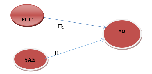 The dependent variable in Figure 1 is Audit Quality, denoted as AQ. The latent variable of auditors' dysfunctional conduct (ADB) was assessed using two variables: fear of losing clients (FLC) and appraisal of staff auditors (SAE). The arrows representing the movement from FLC and SAE, which are independent latent variables, to audit quality (AQ), indicate that these two latent factors were being examined for their direct impact on audit quality.