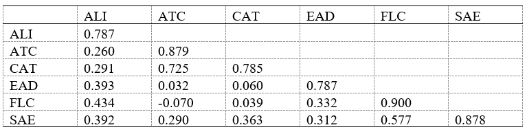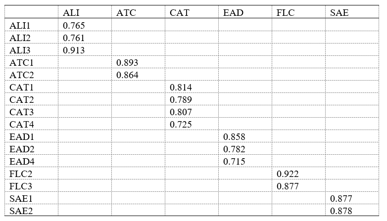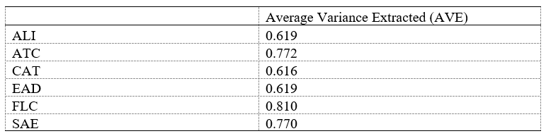 In the factor loading given in Table 1, all of the constructs have factor loading values larger than 0.7. The factor loading threshold for constructs and indicators has been reached. As a result, the shared variance between the construct and its indicators is greater than the variance of the error term of 0.5 used in this study because no items in the sample had factor loadings less than 0.50 after removing the construct of ATE and its indicators for failing to meet the threshold (Table 1).