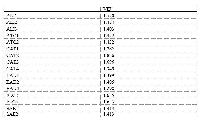 Furthermore, according to Fornell and Bookstein (1982), the variance inflation factor (VIF) is used to calculate multicollinearity indicators. According to Hair et al. (2016), multicollinearity is not a significant issue if VIF is less than 0.5. The VIF value for the study's indicators is higher than the suggested threshold, and as a result, the results are presented in Table 2.