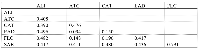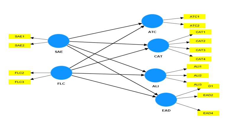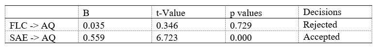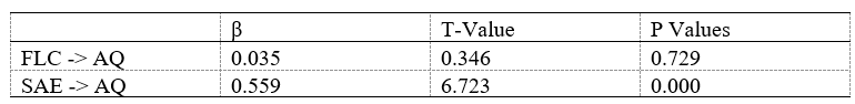 The evaluation of structural models considers how various variables interact with one another. To accomplish this, the researchers examined path coefficients from independent variables to dependent variables and validated higher-order constructs. There was an investigation investigating the direct relationship between FLC and AQ and between SAE and AQ. Path coefficients were used to assess the concept connection. The bootstrapping approach was used over 5,000 iterations with no sign changes to analyse the significance links of all constructs (Clauss, 2017; Hair, 2011; see Table 7).