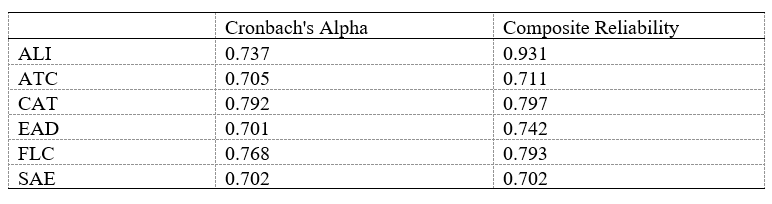 Cronbach's Alpha and composite reliability were employed in the study to assess the internal consistency of the components. The results of the tests, as given in Table 3, reveal that all variables exceed the recommended Cronbach's Alpha threshold level (> 0.70), and all constructs likewise exceed the suggested minimum level (> 0.70) for composite reliability. Cronbach's Alpha ranged from 0.701 to 0.792, while composite reliability ranged from 0.702 to 0.931. The dependability statistics for the two reliability indicators are above the acceptable level of.70 (Hair et al., 2011). As a result, the dependability of the construction is proven.