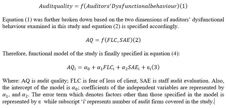 This research utilises the empirical model developed by Fleischman and Valentine (2019), which aligns with the theory of reasoned action and attribution theory. The objective of this study is to investigate the impact of the expense associated with exercising professional knowledge on the quality of audits. The dependent variable, audit quality, is represented as a function of the independent variables, specifically the cost associated with exercising professional knowledge, as denoted in equation (2).