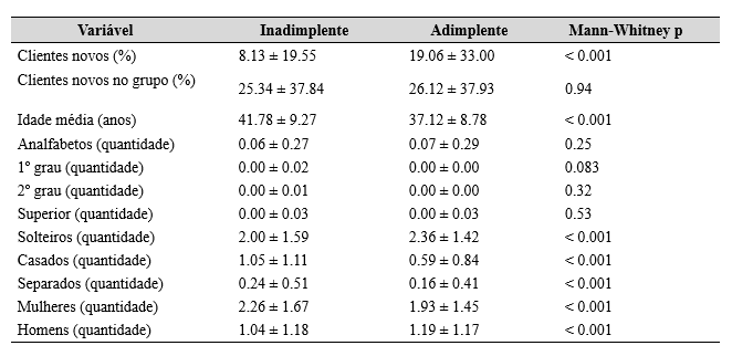 As estatísticas descritivas das variáveis numéricas foram expressas em média e desvio- padrão, e o teste de Mann-Whitney foi aplicado para comparar os grupos inadimplentes e adimplentes. Em seguida, realizou-se uma análise de regressão logística multivariada para modelar a relação entre a inadimplência e os dados dos grupos.