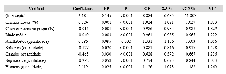 A partir dessa análise, foi selecionado o modelo final selecionado, que considerou oito variáveis independentes, todas significativas (p < 0,05). A proporção de clientes novos (B = 0.024; OR = 1.024) e a quantidade de analfabetos (B = 0.286; OR = 1.331) e de homens (B = 0.199; OR = 1.126) tiveram coeficientes positivos, o que sugere que um aumento nessas variáveis está associado a um aumento na chance de inadimplência.
