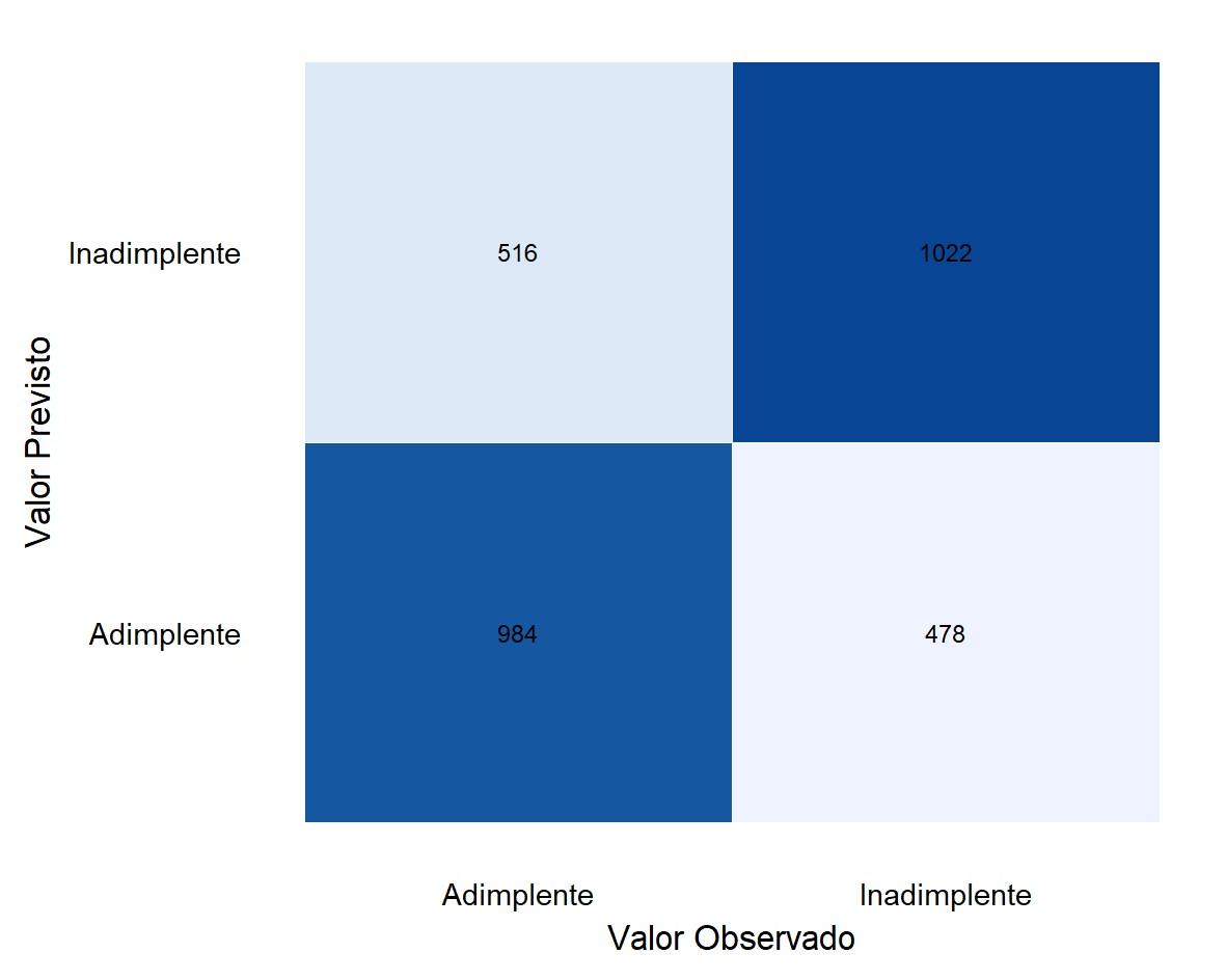 Na etapa de teste, o modelo selecionado foi usado para classificar os grupos como inadimplentes ou adimplentes, e os resultados foram comparados com os dados originais. Foram calculadas a acurácia, a sensibilidade e a especificidade das classificações do modelo no conjunto de teste. A acurácia representa a proporção de classificações corretas em relação ao total de casos, enquanto a sensibilidade mede a proporção de verdadeiros positivos classificados corretamente, e a especificidade mensura a proporção de verdadeiros negativos classificados corretamente (WONG; LIM, 2011). Todos os testes foram realizados com um nível de significância de 5%.