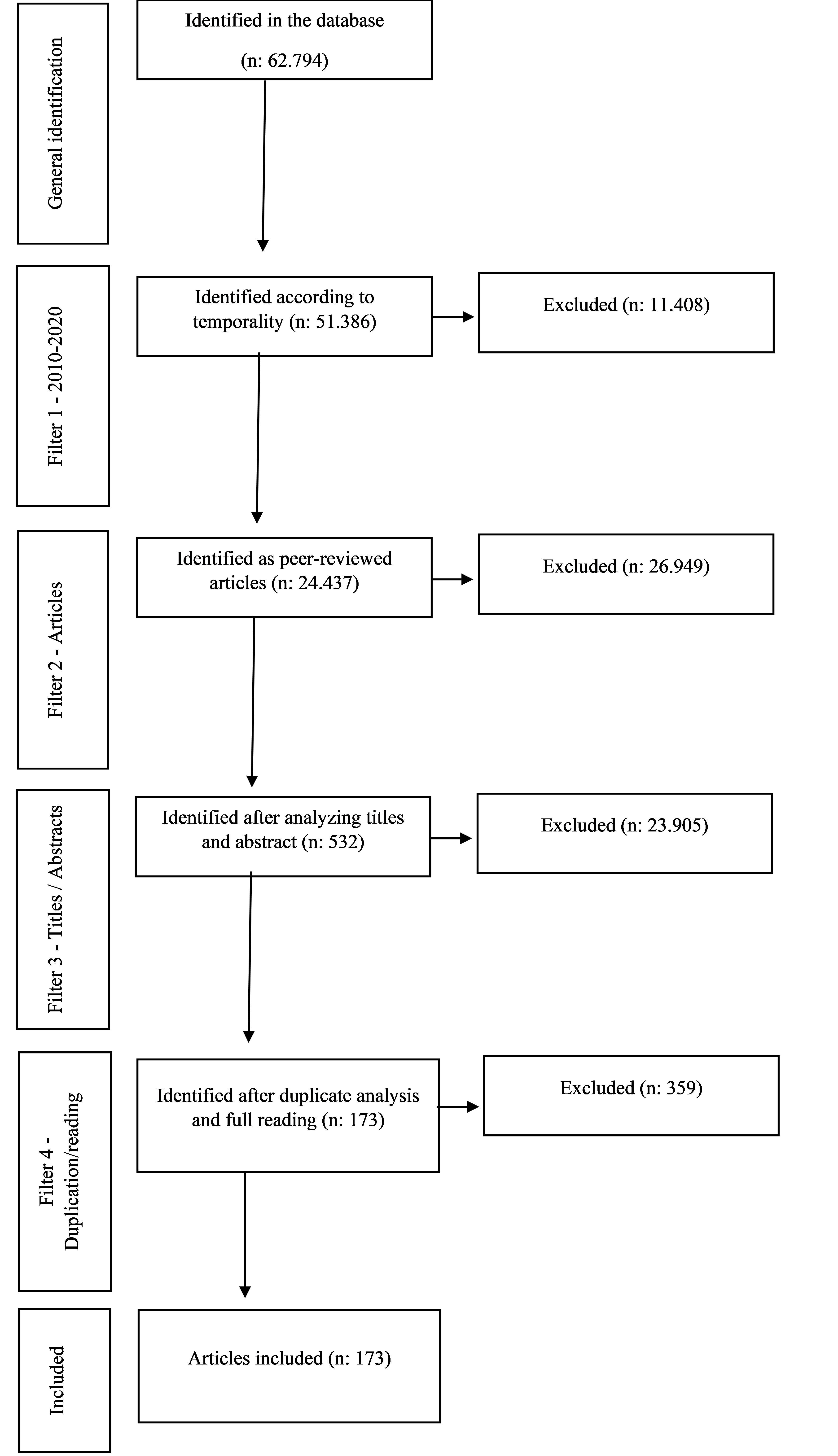 The second point was to define what would be the inclusion or exclusion criteria of the articles (Botelho, Cunha e Macedo, 2011). The first point seen was temporality, we decided to observe the scientific production between the years 2010 to 2020. The second criterion was the reliability of this production, for this reason we chose only peer-reviewed articles. In the third stage, critical evaluation of the studies (Botelho, Cunha e Macedo, 2011), we analyzed by title and abstract using the Mendeley Desktop software, which is a bibliographic reference manager, we also observed if there was duplication and read the articles in full, to identify if they addressed the second-order SEM-PLS as a method. Graph one demonstrates the use of filters