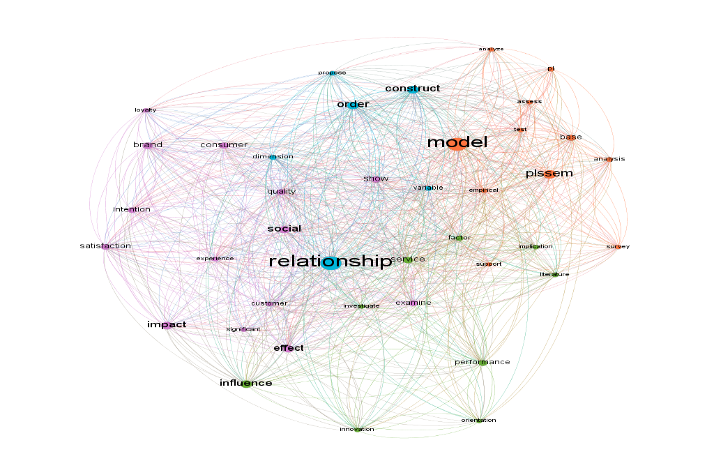 Clearly, this grouping is focused on the findings of the chosen research, as evidenced by the words impact, social, and examine, among others. It is worth noting that studies that use SEM-PLS focus on the context of social research, with words such as social, consumer, tourist, behavior, user, experience, perception, consumer group, trade, and others appearing in this grouping. This result could be due to the complexity of measuring variables in the social context, in which case Hair et al. (2017), reports that the second-order SEM-PLS can better analyze complex variables. The second group follows the same path as the first, with relevance to social research but a greater emphasis on business, as shown in Figure three.