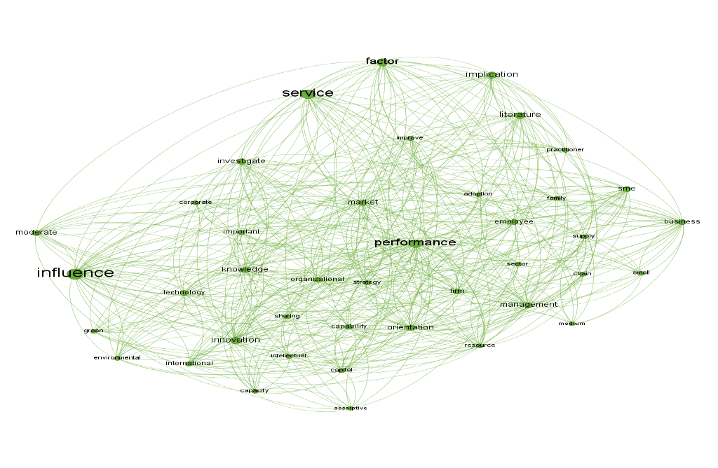 We emphasize in this grouping, which accounts for 27.33 percent of the nodes, that the studies focus on micro and small businesses, with the main goals being the observation of organizational performance as well as the influence of variables. We also highlight some research topics that emerge, such as knowledge, management, innovation, technology, internationalization, strategy, service sector, sharing, and environmental concern, among others. Despite addressing several themes, it is clear that some themes that could be included in this scope are missing, such as entrepreneurship, learning, and culture, among others, which fit as complex themes to be measured. The last two groups (figure four and five) account for 42.67 percent of the total (26 percent and 16.67 percent respectively). Thus, while the previous two focused on the research objective, these two share the methodology used in the research.