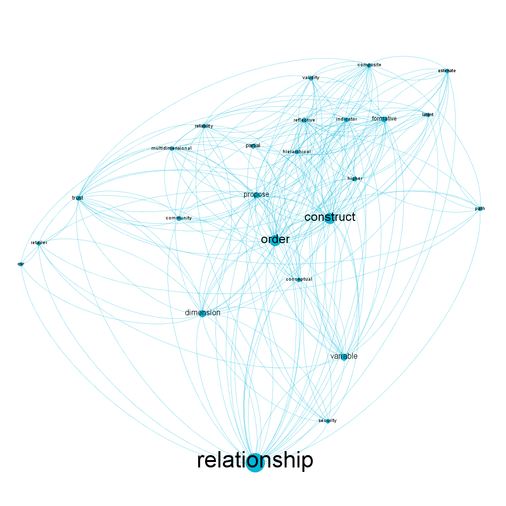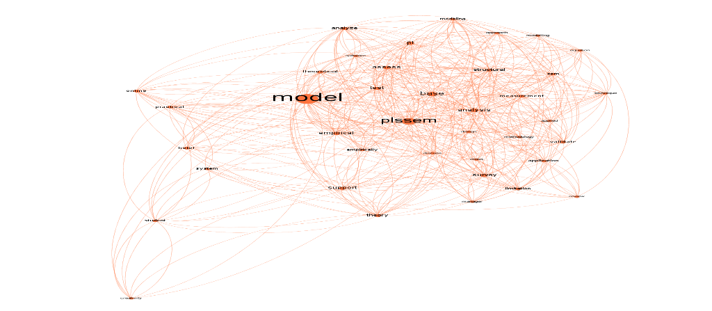The analysis of betweenness centrality allows us to see how frequently a node appears at random between two nodes in the network (Paranyushkin, 2011). According to the author, in a text analysis context, this measure is more important than degree because it investigates the influence of specific words in a broader context. When the degree of a word is counted, it can have a high index of connections in a small grouping of the text, whereas the betweenness centrality examines the influence of certain words in the entire text. In our network, the first five words with the highest betweenness centrality, in descending order, are: "relationship," "model," "plssem," "construct," and "order." In addition to the words plssem, model, and order that represent the method we focus on, the words' relationship' and 'construct' are also closely related to the method, as it measures the relationship between variables/constructs.