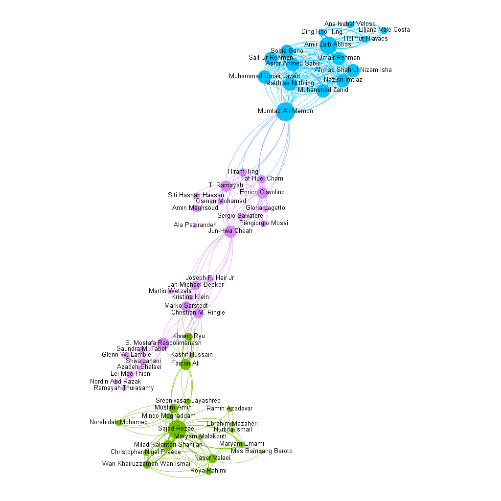 A faster path is observed in terms of betweenness centrality, which observes the network actor that acts as a bridge between other actors (Van der Hulst, 2009). According to the author, nodes with higher betweenness centrality have greater network power because they can isolate, influence, manipulate, or prevent contact with other nodes. Jun-Hwa Cheah, Faizan Ali, and Mumtaz Ali Memon are the three actors in our network with the highest betweenness centrality, from highest to lowest. Looking at our network, we can see that these three authors are the links between the green, lilac, and blue color groups. Confirming the report of Van der Hulst (2009), these authors play the role of bridging author groups.