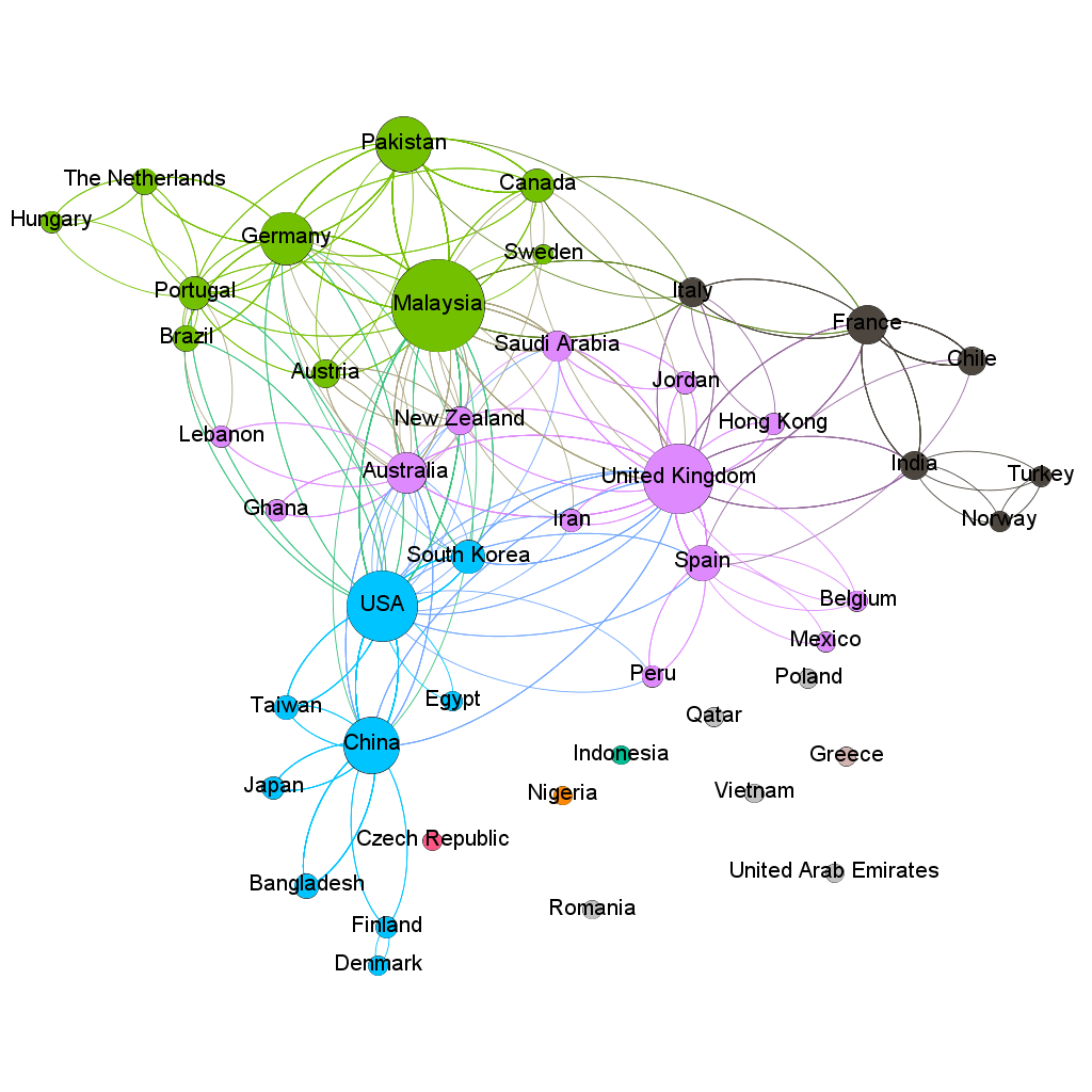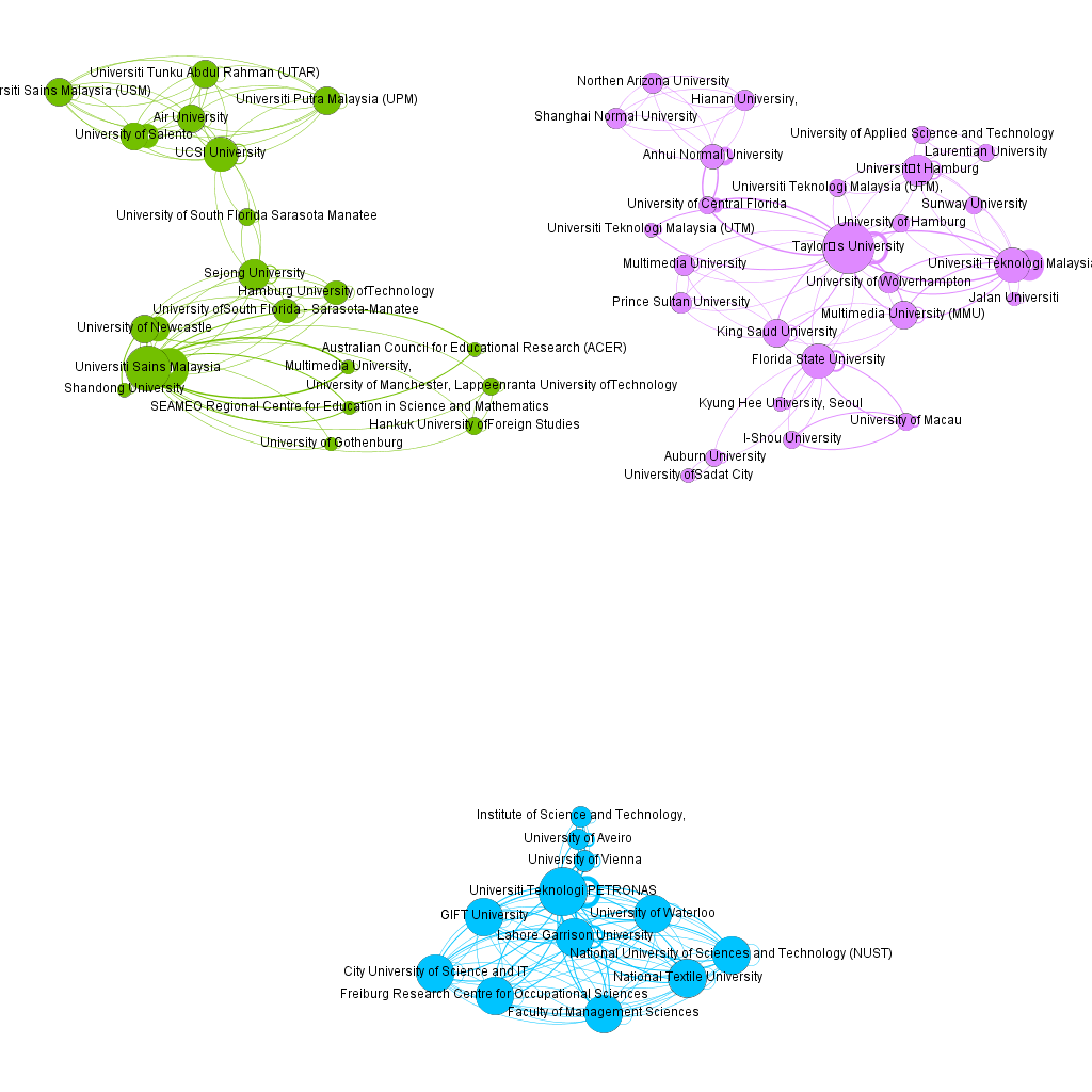 When we observe the existence of a collaboration network between institutions, we highlight Taylor's University as the institution with the greatest number of connections in the network (26). Universiti Teknologi PETRONAS (connection degree: 24), also in Malaysia, was the second most connected institution. The third notable institution is the Universiti Sains Malaysia (Degree of connections: 22). It should be noted that Malaysia is home to the three major universities with the most connections.