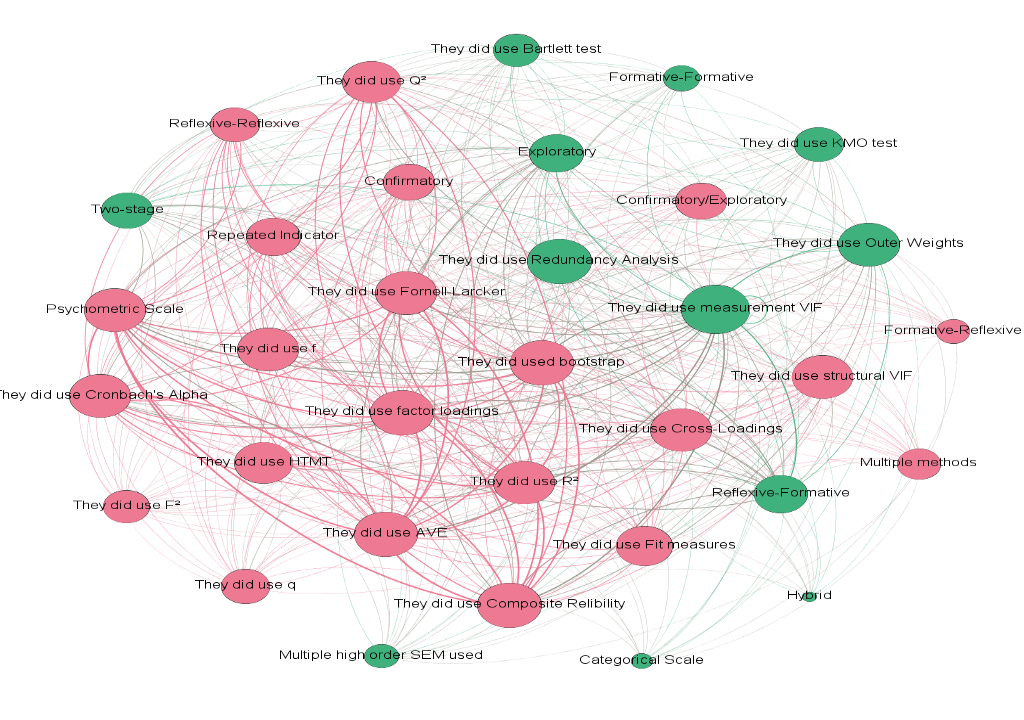 The authors' lack of clarity when explaining the use of the second-order SEM-PLS technique stands out. Only the words "order," "hierarchical," and "higher" are described; however, the word "order" is not entirely associated with the second order; it can also refer to the first order. Another factor to consider when employing the second-order technique is the type of second-order employed. The article abstracts do not clearly show which types are used, and none are found in the word networks.