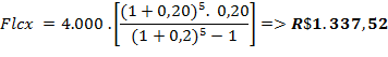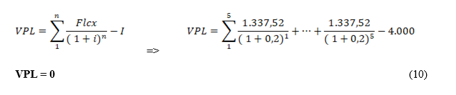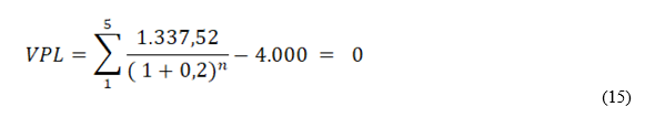Com estas informações, pode se fazer o seguinte raciocínio: se o investimento tem que gerar um retorno de 20% ao ano, é possível aplicar um cálculo de série de pagamentos uniformes postecipados, entendendo o investimento como capital inicial, a taxa de juros sendo a taxa de remuneração e o tempo de aplicação. Isso gerará fluxos de caixa uniformes ao longo deste período que definirão o volume mínimo necessário para viabilizar o negócio.