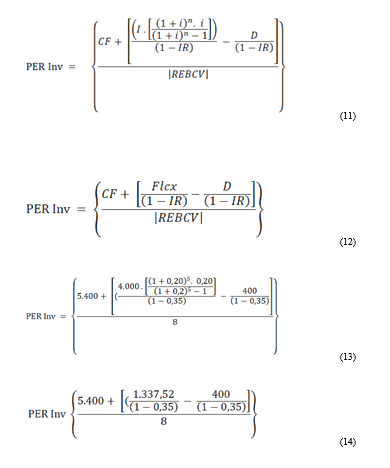 Da mesma forma, caso tivesse um CMPC diferente, ter-se-ia um outro valor objetivo de fluxo de caixa ( flcx), o que resultaria em um PER – Inv diferente.