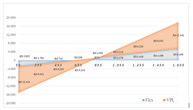 Fica claro que o ponto em que o VPL é 0, o volume de produção é 855,29 e o resultado do fluxo de caixa é R$1.338.