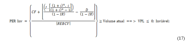 Se o ponto de equilíbrio da redução com investimento (PER-Inv) em unidades for maior do que o volume de produção atual, então o valor presente líquido do fluxo de caixa será negativo e o projeto é inviável. Caso sejam iguais, determina-se inviável também. Tem-se a expressão matemática: