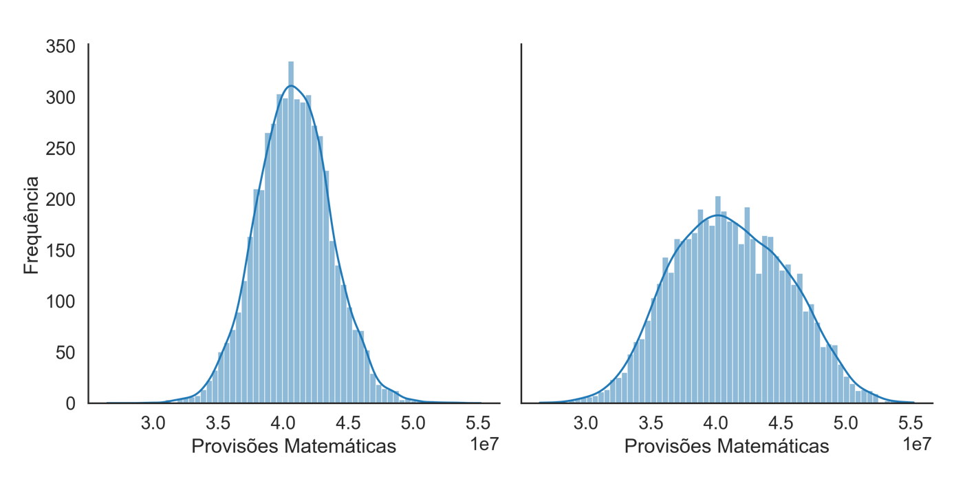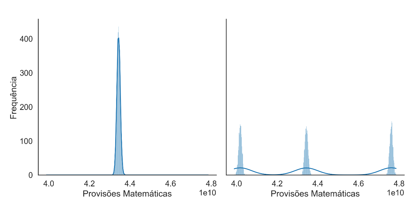 As Figuras 1 e 2 apresentam a distribuição do valor das provisões matemáticas dos grupos de 50 e 50.000 segurados, mostrando os cenários com e sem o risco sistemático. As distribuições são acompanhadas por curvas de suavização geradas pelo Método de Estimação por Kernel, uma abordagem não-paramétrica para estimar a Função Densidade de Probabilidade de uma variável aleatória, sendo esta visualização confeccionada por meio do pacote gráfico seaborn.
