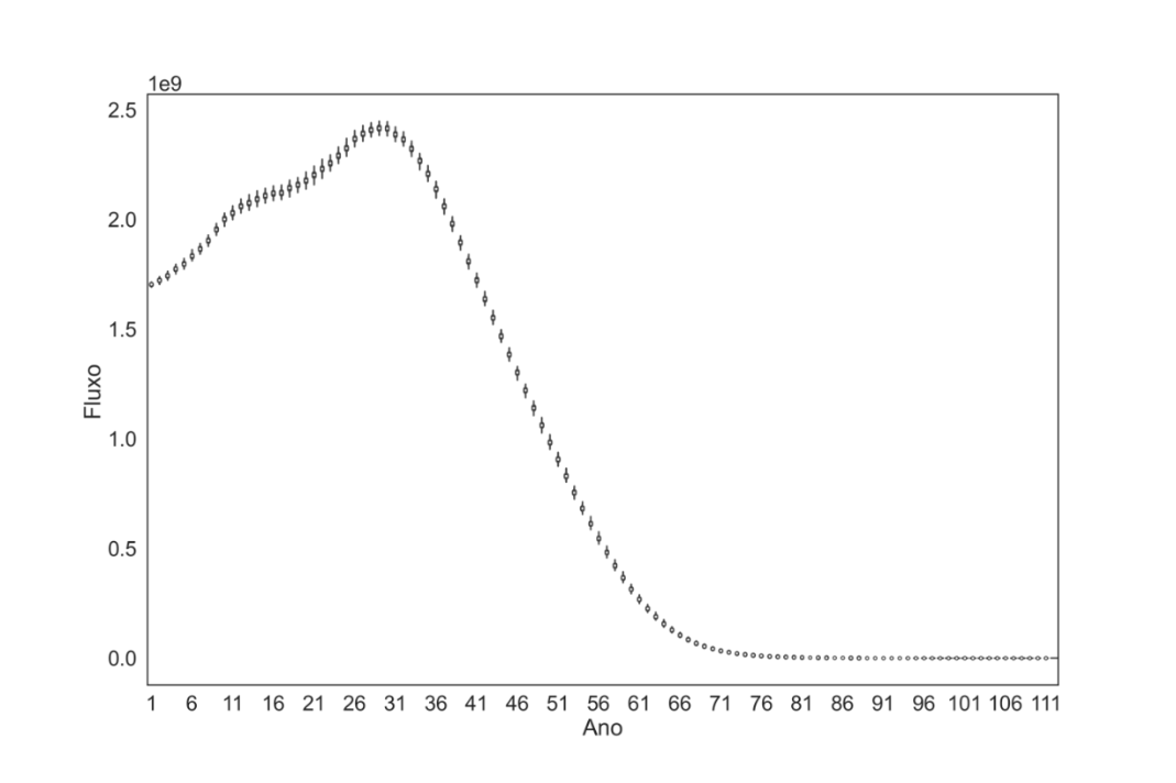 Figura 3 – Fluxo de pagamentos projetados para o grupo com 50.000 segurados sem o risco sistemático