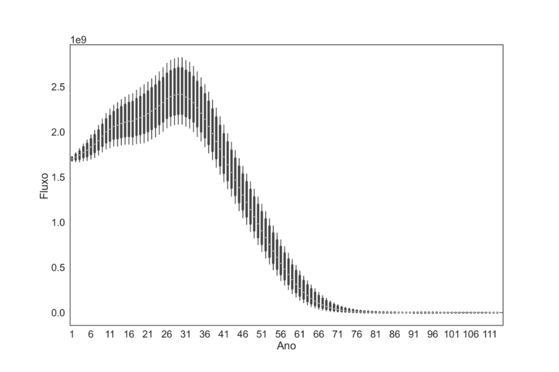 Figura 4 – Fluxo de pagamentos projetados para o grupo com 50.000 segurados com o risco sistemático