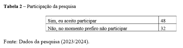 A aplicação do formulário de pesquisa foi feita nas duas maiores feiras de artesanato do Brasil e da América Latina, na 23º edição da Fenearte e na 21º edição da Fenahall. No total, foram entrevistados 80 artesãos fazendo a junção dos resultados obtidos nas duas feiras. Conforme gráfico abaixo, é possível observar que das 80 respostas obtidas, apenas 48 (60%) se propuseram a participar de fato da pesquisa, respondendo com afinco as perguntas, enquanto 32 (40%) não puderam responder a pesquisa, por alegarem falta de tempo e também por não serem donos do estabelecimento e explicar que não saberiam, de fato, responder tais perguntas, pois tal conhecimento em relação ao gerenciamento e mecanismos de precificação dos produtos estariam contidos exclusivamente na mão do artesão, dono dos produtos comercializados.