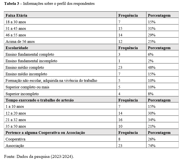 Quanto ao perfil dos respondentes, em relação às respostas válidas, conforme tabela 1, é possível observar que, em sua maioria, 23 respostas da amostra pesquisada dizem ser formados no ensino médio enquanto 9 possuem curso superior completo ou incompleto. A pesquisa mostra que, aqueles artesãos que possuem curso superior completo ou incompleto, têm formação nas seguintes áreas: Marketing, Economia, Gestão, Designer Gráfico e Engenharia Civil. Em relação à faixa etária, observa-se que a maior parcela da amostra se concentra entre 31 a 56 anos (mais), o que corresponde a 41 respostas da amostra. Ademais, ainda acerca da escolaridade, 5 pessoas da amostra pesquisada dizem não possuir formação escolar, e que adquiriu o conhecimento acerca da produção do artesanato na vivência do trabalho.