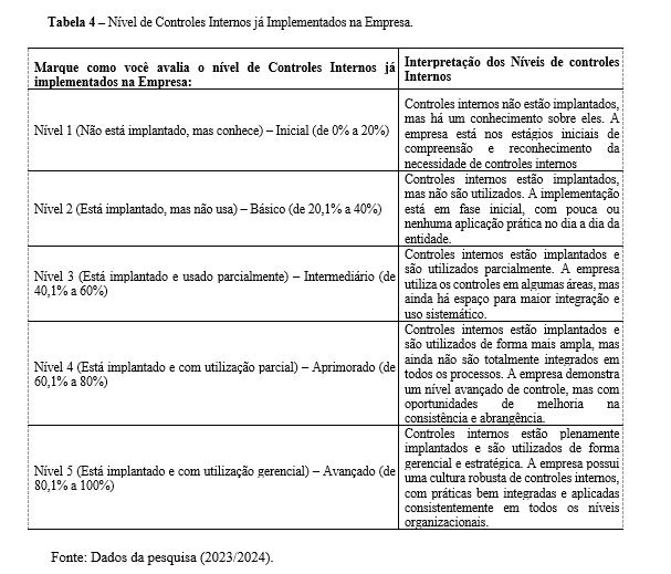 O formulário aplicado possui uma escala de níveis sobre práticas de controles contábeis e gerenciais, utilizada pelo Tribunal de Contas da União (TCU) para medir os riscos. Com relação ao Nível de Controles Internos Já Implementados na Empresa, é aparente que, conforme tabela abaixo, menos da metade dos artesãos responderam o Nível 3, o nível de controle interno está implantado, mas usa parcialmente, conforme Tabela 6.