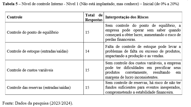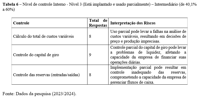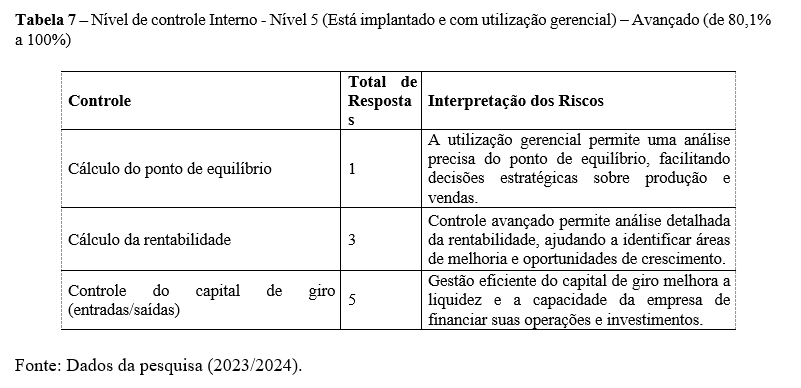 Conforme a tabela 6, há cinco níveis de controle interno, mas a pesquisa indica que os gestores têm maior conhecimento entre o Nível 1: Inicial (0% a 20%) e o Nível 3: Intermediário (40,1% a 60%). No Nível 3, as práticas incluem o cálculo ‘total dos custos variáveis’ e o ‘Controle de Capital de Giro’. O uso parcial desses cálculos pode levar a falhas na análise, interpretação e tomada de decisões. A falta de controle do capital de giro pode resultar em sérios problemas de liquidez, incapacitando a entidade de realizar suas operações diárias (DAS, 2023).