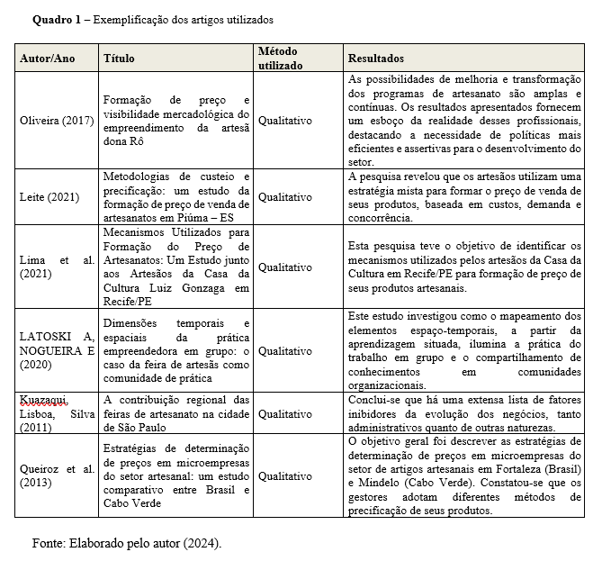 A revisão sistemática sobre os mecanismos utilizados para a formação do preço dos artesanatos foi realizada com base em periódicos especializados na gestão de cooperativas, disponíveis na plataforma da Coordenação de Aperfeiçoamento de Pessoal de Nível Superior (Capes), e a base SciELO (Scientific Electronic Library Online) foi escolhida por ser um modelo de publicação eletrônica e comunicação científica nos países em desenvolvimento, especialmente na América Latina e no Caribe.