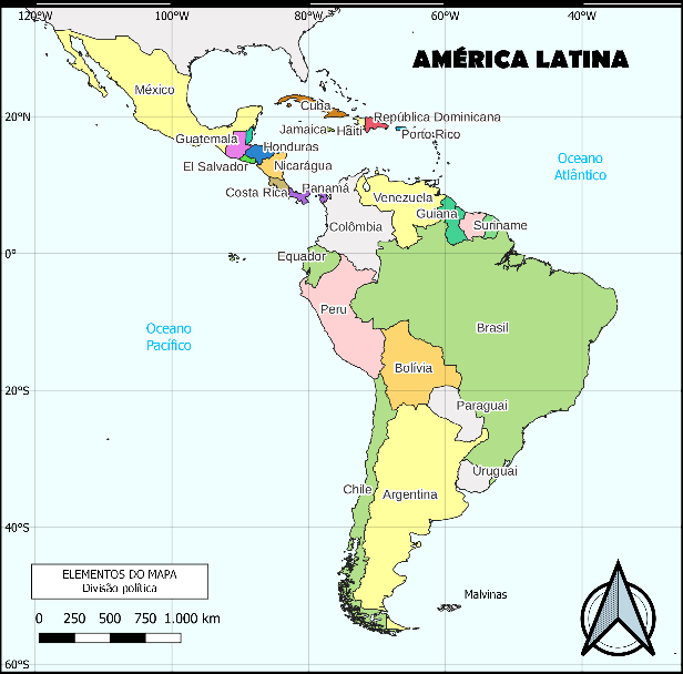 Figura 2: Divisão política da América Latina, em 2023, mapa elaborado pelo autor. |