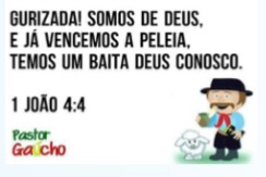 Na pregação a seguir, extraída de 1João 4:4, publicada na timeline da página do Pastor Gaúcho no facebook, no dia 29 de maio de 2016, nota-se o uso de expressões típicas do Rio Grande do Sul, como: gurizada, que se refere a garotada, a jovens, e que substitui filhinhos; peleia, que vem de pelejar, e significa “Batalhar, combater” (HOLANDA, 2010, p. 575), servindo como termo equivalente a: os (eles, os oponentes); e baita, usada, normalmente, pelos gaúchos para designar algo grande, maior, e que, de fato, se equipara ao verbete maior. Juntamente com a ilustração do pregador, colocada no canto inferior direito do sermão, e do título, colado no canto inferior esquerdo, as palavras destacadas, pertencentes ao dialeto gaudério, conduzem o olhar do leitor, de certa forma, a uma leitura voltada para um cristianismo regionalista, que tem como foco evangelizar o povo gaúcho e perpetuar a sua cultura.