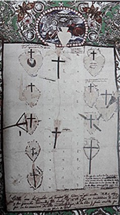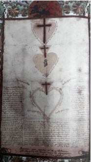 Lo único que se conserva de Rosa, son algunas cartas y dos pliegos con collage emblemáticos, en papel y tela de distintos color, “acertijos místicos” y mensajes de puño y letra de la Santa, hallados en 1923 en el monasterio limeño de Santa Rosa de Santa María. Uno se refiere a las “Mercedes o heridas del alma” y el otro a la “Escala espiritual”. (Mujica Pinilla, 2001, 136)