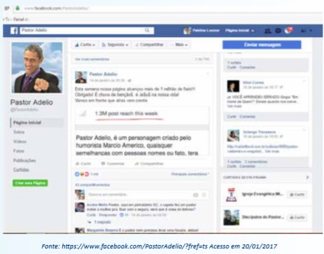 Há ainda uma série de vídeos publicados pela personagem do Pastor Adélio, tanto no YouTube quanto linkados ao Facebook14, que falam sobre religião, no entanto, os vídeos ora mencionados são os de maior relevância para a pesquisa por se tratar de vídeos com temática bíblica, vislumbrando lacunas no texto sagrado as quais o Pastor Adélio encontrou e a forma como as utiliza para produzir um tipo de humor, um humor irônico-satírico, cuja intenção é fazer uma crítica à sociedade.