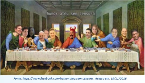 Podemos observar na imagem a representação da Santa Ceia, que originalmente fora pintada por Leonardo Da Vinci, sendo uma encomenda da Igreja de Santa Maria Delle Grazie, a tela retrata o momento em que Jesus Cristo aponta seu traidor segundo a passagem bíblica João 13: 21. No entanto, na página do Humor Sem Censura a imagem está, humoristicamente, com novos personagens, com rostos de pessoas conhecidas da atualidade, representantes religiosos que se destacam por suas pregações como é o caso dos pastores evangélicos aqui representados, os padres católicos mais bem quistos na atualidade e o Papa Francisco que vem tendo grande popularidade mundial, os quais representam a igreja católica, há também jornalistas e políticos representados; no centro, no lugar da personagem principal que é Jesus Cristo, a imagem traz um humorista vestido de Diabo com uma expressão de humor satírico. No entanto, a tela está representada com apenas 11 “apóstolos”, discípulos do diabo, já a imagem original tem os 12 apóstolos. A imagem original segue abaixo: