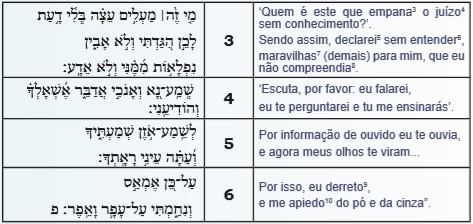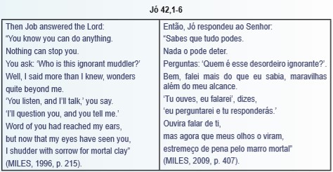 A opção pelo sentido das palavras na tradução acima proposta de Jó 42,1-6 deve ser diretamente creditada à tradução proposta por Jack Miles (MILES, 1997, p. 40712). Metodológica e operacionalmente, a partir da mencionada tradução de Miles, o pesquisador traduziu ele mesmo o texto hebraico da Biblia Hebraica Stuttgartensia, consultando um a um todos os sentidos de cada palavra no dicionário de Alonso-Schökel (1997), para certificar-se de que elas potencializavam e suportavam gramaticalmente o sentido atualizado na tradução de Miles. O resultado é positivo. Todos os sentidos propostos por Miles em sua tradução são atualizações possíveis e previstas dos sentidos potenciais das palavras hebraicas empregadas no texto de Jó 42,1-6. Eis a tradução de Miles, em seu original inglês e na tradução da edição brasileira: