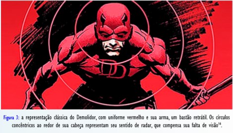 [10]Por oportuno, é importante ressaltar que este artigo não tratará da recente série televisiva (duas temporadas até o momento) do Demolidor, uma parceria da Marvel, que detém os direitos do personagem, com o canal de streaming Netflix. A narrativa de origem do Demolidor nesta série televisiva é bastante fiel ao registro da biografia ficcional do personagem nas HQ’s, conforme a já mencionada recriação do personagem conduzida por Frank Miller.