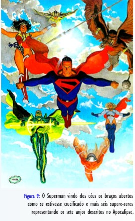 O retorno do Superman com mais seis super-seres faz alusão ao texto de Apocalipse 8.2: “Vi os sete anjos que se acham em pé diante de Deus; a eles foram dadas sete trombetas.” Nota-se que na imagem abaixo, o herói aparece com os braços abertos e a pernas juntas, representando Jesus crucificado vindo dos céus. Por outro lado pode ser entendido um como os sete anjos descritos na passagem bíblica citada.