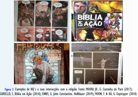 O importante, afirma Reblin (2014), é que essas intersecções, enquanto construtos teóricos, podem traduzir HQ`s que não se prendem a uma só dada categoria. Na Figura 3 pode ser dito que a HQ “Bíblia em Ação”, por seu teor de ilustrar as narrativas bíblicas com a finalidade de evangelizar e provocar no leitor e leitora a possível adesão, via conversão, à fé cristã, enquadrar-se-ia no primeiro tipo de intersecção mencionada por Reblin. Já a HQ “Hellblazer” (quadro inferior esquerdo na Figura 3) mostra como a personagem John Constantine, um mago, é construído de forma a satirizar e criticar diferentes tradições religiosas e místicas, principalmente o Cristianismo. Com o uso da linguagem irônica e sarcástica, a HQ poderia ser lida a partir da intersecção 2 proposta por Reblin.