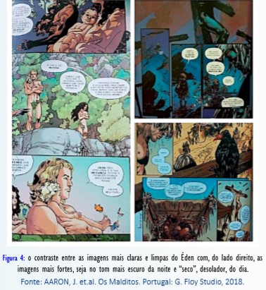 A terra retratada por Aaron é desoladora. Melancólica, sem vida, suja, violenta. Nesse aspecto a arte de Guéra e a paleta de cores de Brusco combinam muito bem: o traçado quase rústico, com as imagens em segundo plano “borradas”, a cor negra muito forte na arte-finalização dos desenhos, o foco dos quadros nas expressões faciais das personagens para enfatizar determinados sentimentos como a amargura, o ódio e a desesperança marcam boa parte da narrativa visual de Guéra potencializada pelas cores escuras e sombrias de Brusco. Quando a narrativa se passa durante o dia a paleta de cores privilegia tons pasteis, alaranjados, ocres, principalmente na ambientação, o que reforça a visualidade de uma terra seca, desolada. Exceção feita, no início do Capítulo 3, quando há um flashback a mostrar o Éden, em sua exuberância, e um breve diálogo entre o casal primevo com seus filhos no colo (Figura 4):
