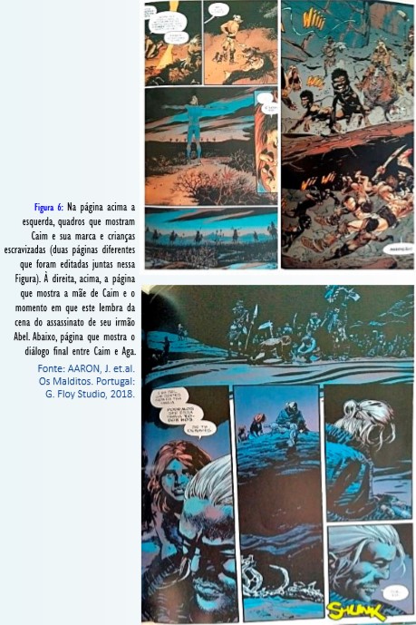 Por fim, o último quadro no canto superior direito da Figura 5. Trata-se de uma página emblemática: mostra Caim crucificado pelo seu opositor, Noé. É inegável que a imagem nos remeta a narrativas neotestamentárias da crucificação de Jesus. Se na mitologia cristã a relação entre crucificação e ressurreição de Jesus pode ser encarada como uma nova criação, uma vez que o Cristo assume e expia os pecados da humanidade (salvação), em Caim não. Sim: as narrativas guardam semelhanças pois ambos, Caim e Jesus, foram crucificados como resultado de processos violentos. Mas nas intertextualidades míticas propostas por Aaron, a ambiguidade das representações simbólicas é proposta: para Noé a morte de Caim é remidora uma vez que, autocompreendendo-se como o escolhido de Deus, ao eliminar Caim - o inventor do homicídio, toda a violência na terra seria extirpada. O dilúvio anunciado viria para completar essa missão. Porém, Caim não morre. Eis o espanto de Noé: “Nove dias. Há nove dias que estás nessa cruz. E continuas vivo. Então é verdade. Tu és o Caim”. Por outro lado, para Caim a crucificação apenas comprovava a vontade de poder, de violência dos seres humanos, criados por um Deus não menos egoísta e que utiliza da própria violência para atingir seus propósitos. Ao responder a pergunta de Aga se Deus ainda ouvia as preces humanas, Caim é categórico: “Não, Ele ouve perfeitamente. Ouve tudo. Cada grito. Cada choro. Cada suspiro. Cada pedido por misericórdia. Pela morte. Ouve tudo. Está-se é completamente a cagar”. Assim, Caim representa o paradoxo: vive a vida, tão intensa a ponto de não morrer. Mas sua vida errante em busca de sua morte acontece às custas da morte de muitos outros. Esse é o drama estruturalmente assentado nas recriações das narrativas míticas de Aaron junto com o desenho de Guéra e a colorização de Brusco.