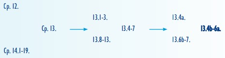 O capítulo 13, como o bloco dos capítulos 12 a 14, também apresenta uma estrutura quiástica, conforme notou Hans Conzelmann, que divide o texto em três segmentos: “(a) vv 1-3; (b) vv 4-7; (c) vv 8-12” (1975, p. 218)12. Sigo, abaixo, a divisão sugerida, inserindo a temática de cada tópico.