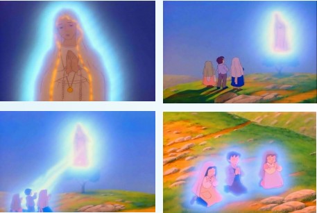 Lúcia pede para irem embora, pois haverá tempestade. Francisco afirma que não há nuvens. Mais relâmpagos ocorrem. O temor das crianças aumenta. Elas se abraçam. As ovelhas se afastam do local. Uma intensa luz paira sobre uma azinheira próxima aos três. Então, aparece “uma Senhora, vestida toda de branco, mais brilhante que o sol, espargindo luz mais clara e intensa que um copo de cristal, cheio d’água cristalina, atravessando pelos raios do sol mais ardente” (MEMÓRIAS DA IRMÃ LÚCIA, 2016, p. 198 - 199). A animação em questão faz uso da luz para indicar a chegada e, posteriormente, a presença mariana no local tal como nas aparições que teriam ocorrido em Fátima e em outras localidades ao longo da história.