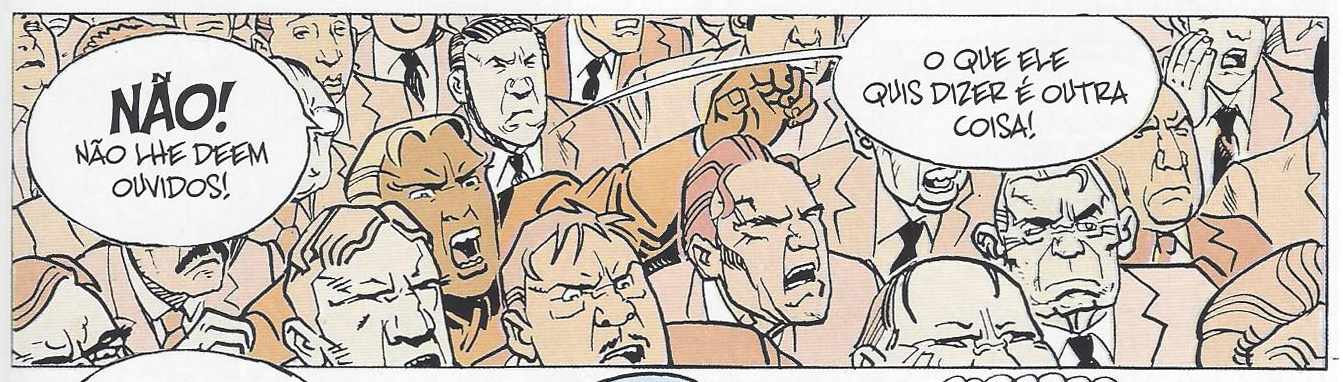 O oposto também é evidenciado: do outro lado da narrativa, a liderança religiosa e a humanidade insensata expressam um discurso escandaloso, irrefletido e violento. Do início ao fim da narrativa os cidadãos refletem uma maneira incauta, guiada pelos ânimos igualmente inconsequentes de seu líder religioso, Colton: “Galactus nos salvará!” (p. 19), “Ele nos conduzirá ao nirvana!” (p. 19), “Matem o nojento inimigo de Deus!” (p. 19), “Cantem louvores a Lorde Galactus [...] Pois quebrou as amarras das leis feitas pelos homens” (p. 36). Ao contrário da sabedoria do Surfista, o fanatismo religioso possui um estilo categórico, imperativo e sem espaço para reflexão; ele ordena comportamentos irrefletidos e, não raro, violenta os que pensam o contrário (ver Figura 10).