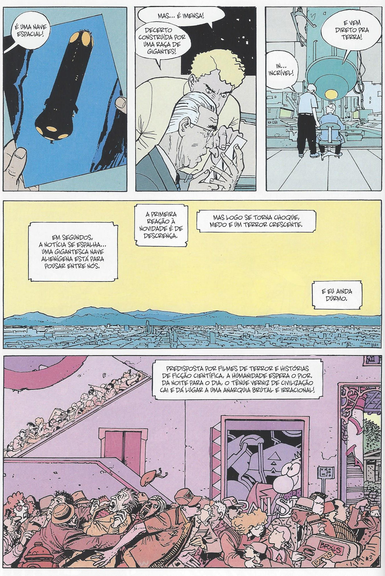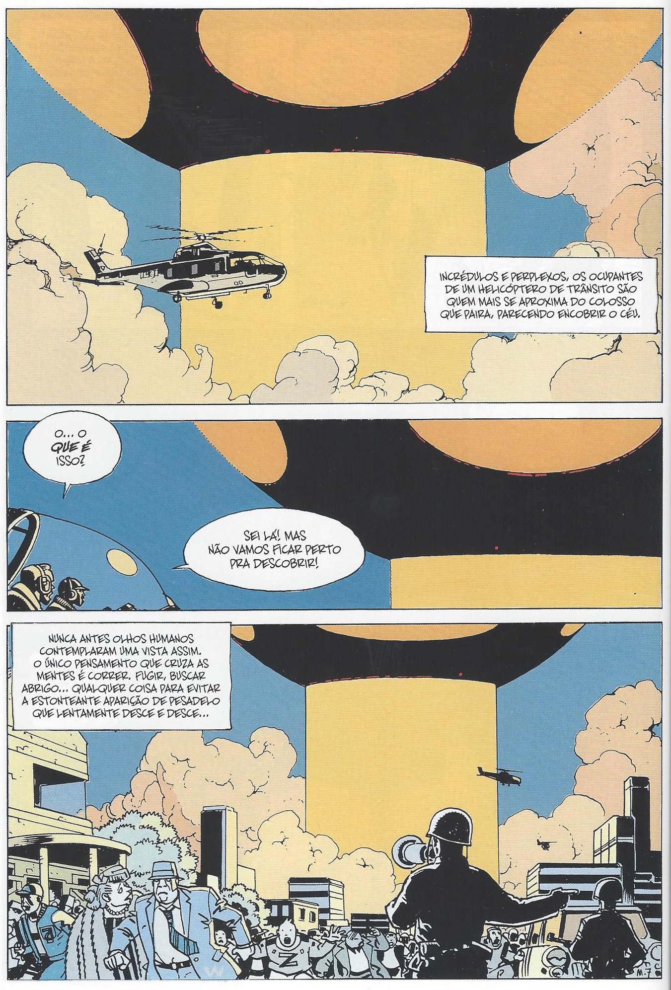 A mesma ideia é apresentada em Parábola de uma perspectiva gráfica, em que o vilão e a nave são apresentados ao lado da cidade, que é visualizada em miniatura – quase como uma “maquete” em questão de grandeza (ver p. 13, 14 e 16). Nas palavras de Moebius: “[eu] queria devolver a Galactus o aspecto monumental que eu achava inerente ao personagem. Quando digo monumental, não falo apenas em tamanho; Galactus podia ser desenhado em escala muito pequena e, mesmo assim, de modo a parecer um verdadeiro gigante” (LEE, 2013, p. 43). A ilustração contrastante parece comunicar a disparidade entre as forças alienígenas e humanas, quando colocadas em embate. Em uma das páginas em que essa perspectiva é apresenta de forma gráfica, a reação da humanidade é descrita pelo narrador em tons de desespero: “Nunca antes olhos humanos contemplaram uma vista assim. O único pensamento que cruza as mentes é correr, fugir, buscar abrigo... Qualquer coisa para evitar a estonteante aparição de pesadelo que lentamente desce e desce...” (p. 14, grifo nosso). A nave não é apenas grande: como em Eclesiastes 9:13-18, ela desafia a força humana e introduz um episódio de caos (ver Figura 3 e 4).