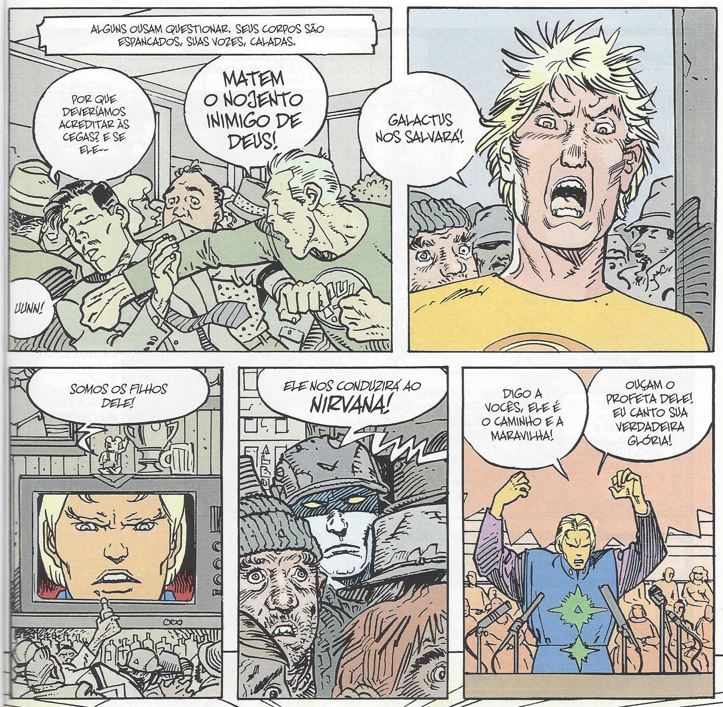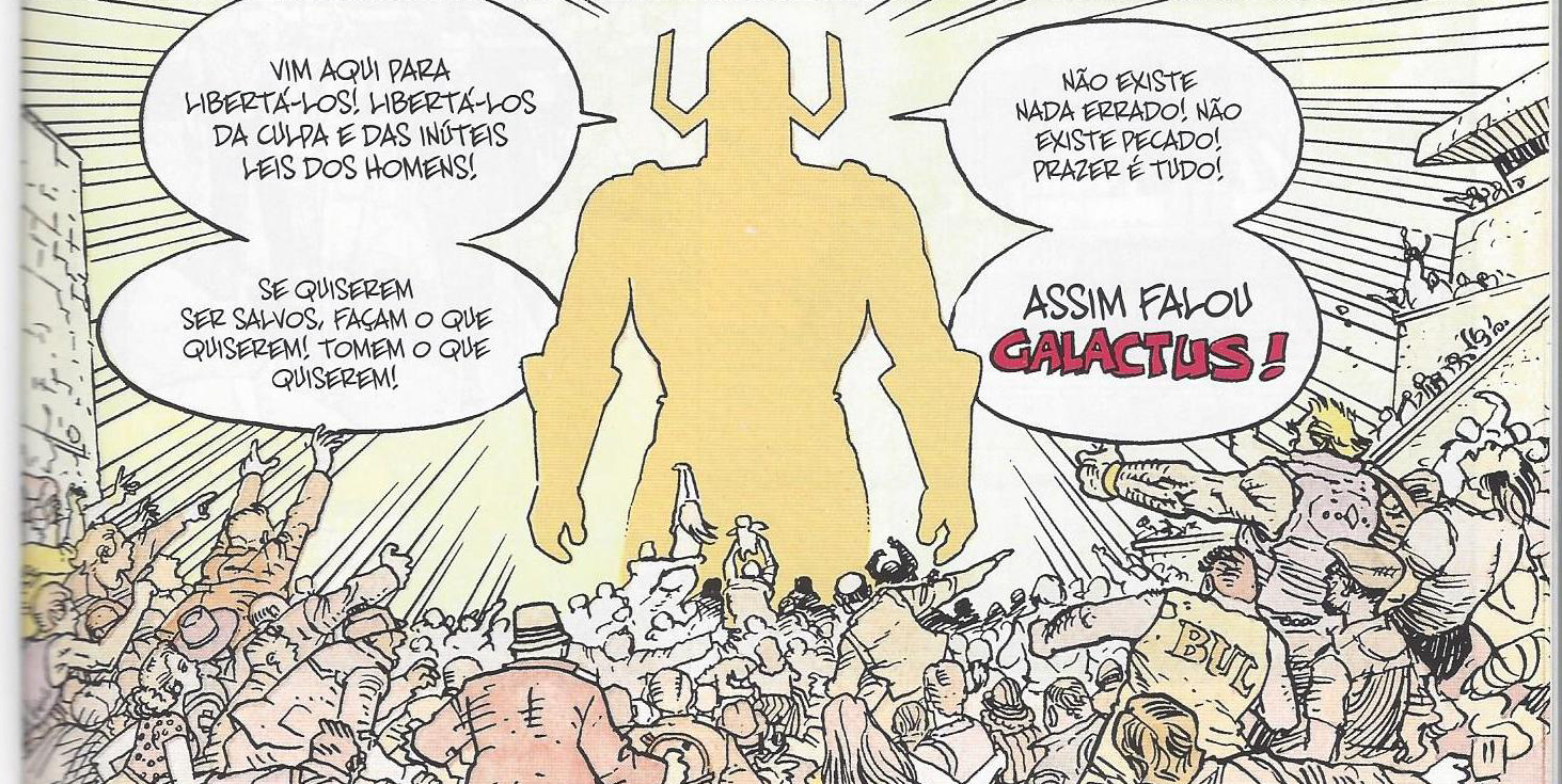 De uma perspectiva muito semelhante, quando Parábola introduz a chegada de Galactus ao planeta Terra, ele passa a expressar um discurso fingido a fim de armar uma emboscada à humanidade: anteriormente, o vilão havia prometido ao Surfista Prateado que não devoraria a Terra. No entanto, quando retorna, ele incute nos terráqueos um discurso de ódio e libertinagem a fim de que os próprios seres humanos se aniquilem e, por fim, ele possa se alimentar do planeta. Com essa armadilha, Galactus estaria cumprindo sua promessa e, ao mesmo tempo, teria o direito de devorar a Terra; na prática os seres humanos foram os protagonistas de sua própria destruição, e não o recém-chegado vilão. Em suas palavras: “Vim em paz” (p. 26); “Em troca da sua adoração, trago-lhes uma nova era” (p. 16); “Não existe nada errado! Não existe pecado! Prazer é tudo” (p. 19); “Se quiserem ser salvos, façam o que quiserem! Tomem o que quiserem” (p. 19), como mostra a Figura 5. O Surfista Prateado, enfim, entende as verdadeiras intenções de Galactus, e observa: “Depois de jurar não acabar com a terra à força, o faz por meio da fraude” (p. 26), como a Figura 6 demonstra.