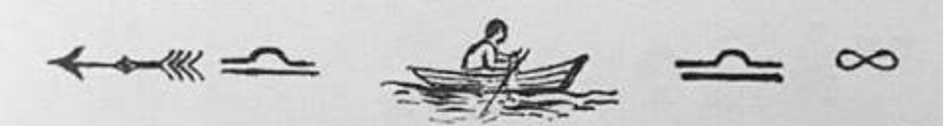 A própria ilustração que acompanha a entrada do conto no “índice ilustrado”[2] presente nas primeiras edições de Primeiras Estórias corresponde de certa forma a essa interpretação. Baseada em um esboço do próprio Rosa, a figura, de autoria de Luís Jardim, ilustra um homem em uma canoa entre dois símbolos que, à luz do profundo conhecimento de Rosa sobre iconografia esotérica atestado por Di Axox (2009), parecem representar o signo de libra — expressões de um estado de equilíbrio dinâmico, como as margens de um rio —, com uma flecha — símbolo do signo de sagitário, associado à transcendência e movimento — à esquerda, e um símbolo do infinito à direita.